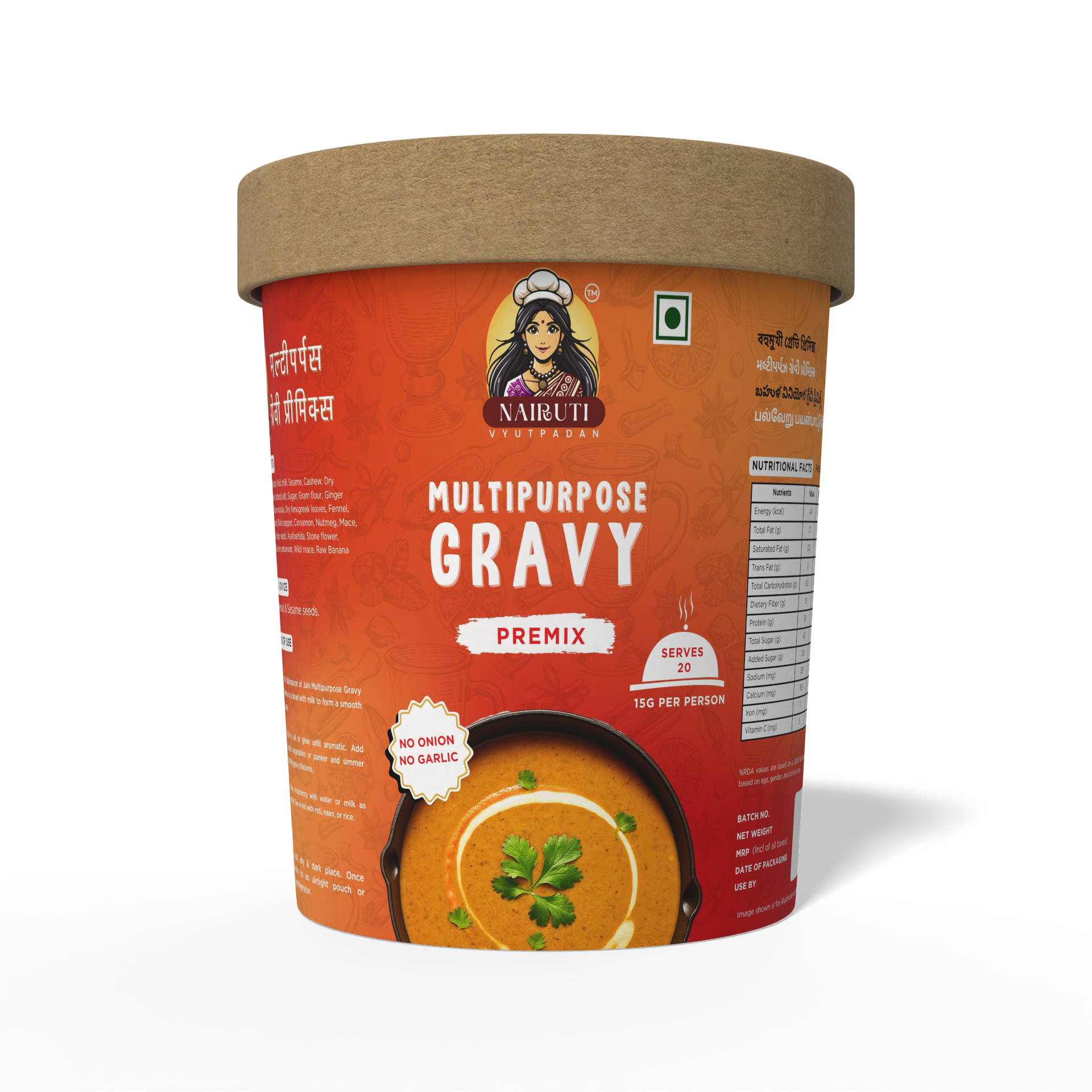 Multipurpose Gravy Premix: Mix with milk/curd & simmer for 2–3 minutes, add veggies or paneer.