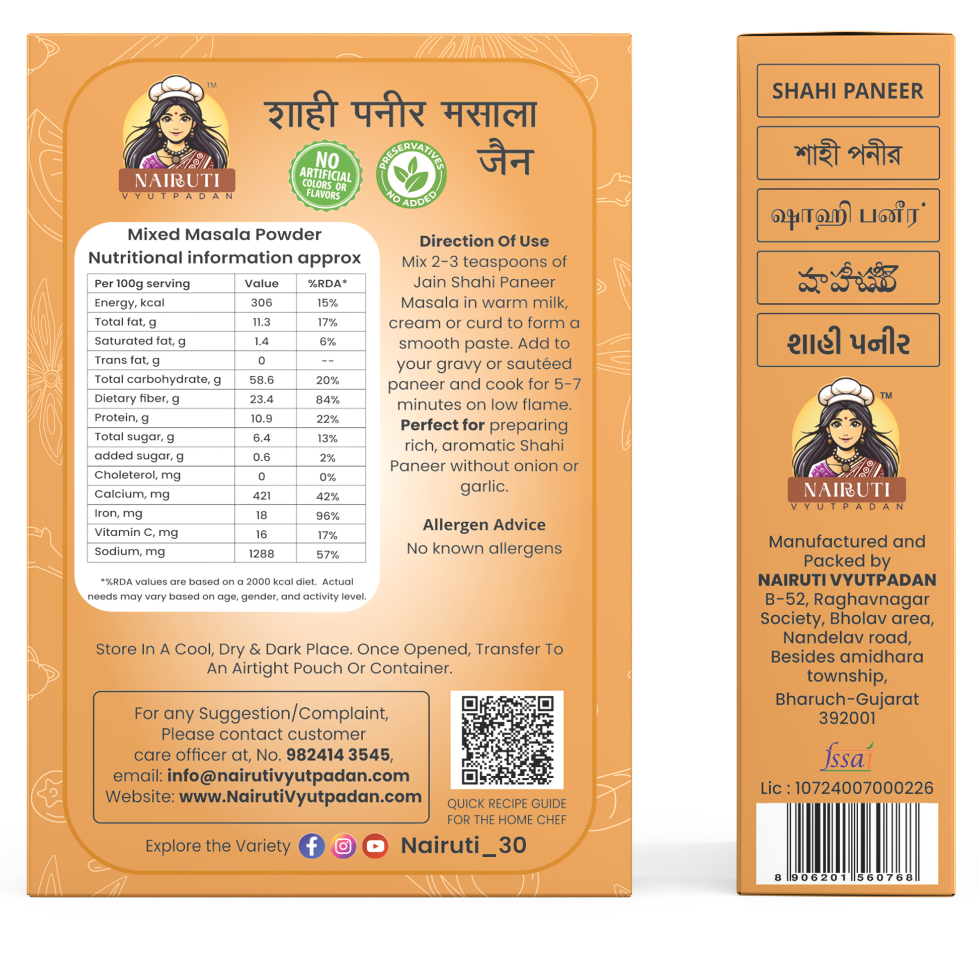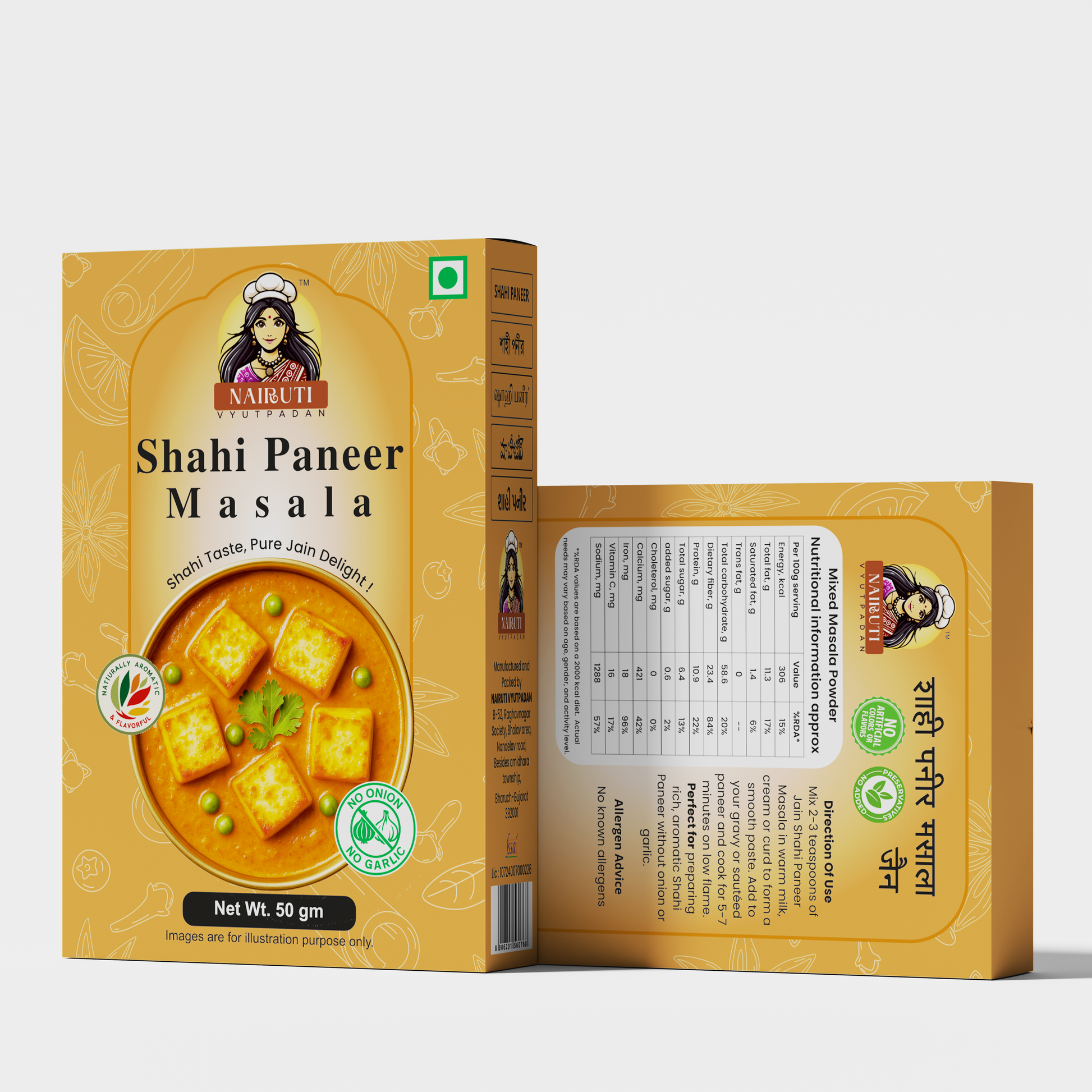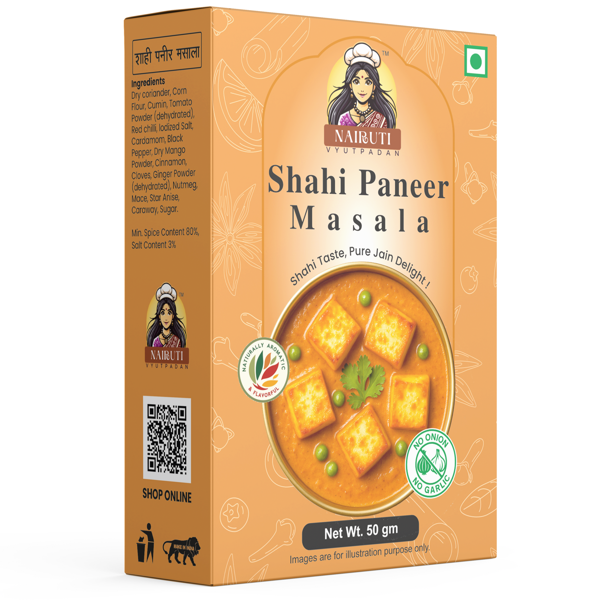 Indulge in the rich and creamy flavors of royal Indian cuisine with our Shahi Paneer Masala - Jain, a specially crafted blend of spices designed to create the perfect Shahi Paneer dish without onion or garlic. This aromatic masala combines the warmth of cardamom, cinnamon, and cloves with the richness of cashews and the tanginess of dried mango powder, offering a perfect balance of sweet, spicy, and creamy flavors. Free from artificial colors, flavors, and preservatives, it’s a must-have for creating restaurant-style Shahi Paneer at home while adhering to Jain dietary principles.